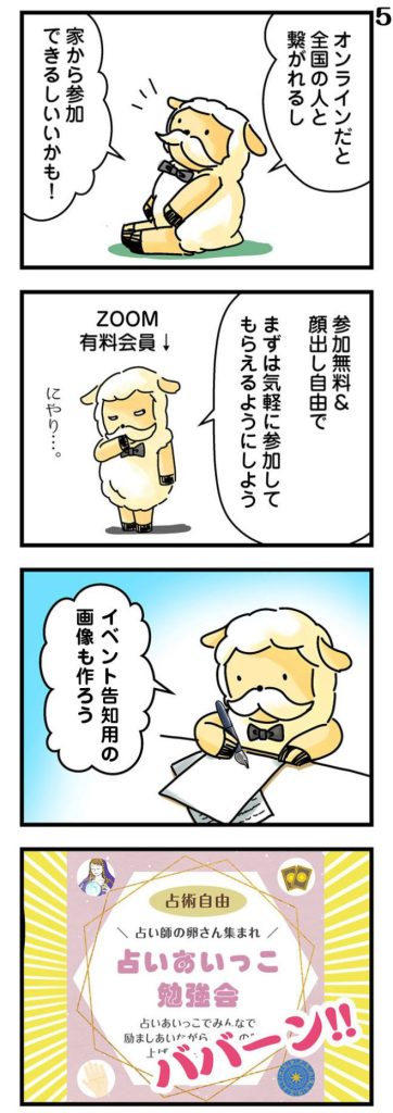 その後、ZOOMにブレイクアウト ルームという機能がございまして、2人部屋を作って、そこでお互い占いあう、というやり方で考えています。